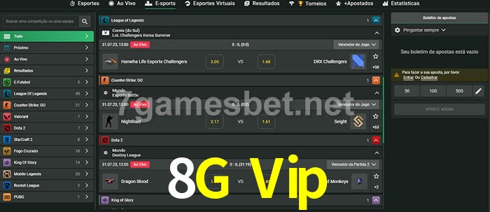 O 8G Vip oferece uma grande seleção de opções de apostas em e-sports com probabilidades competitivas
